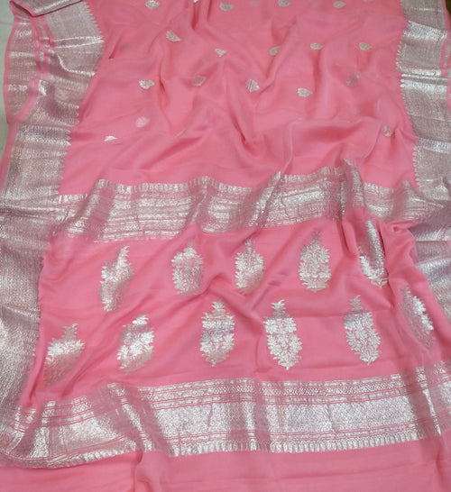 Pure Georgette Banarasi Saree weaving faux jaal watergold zari in pink -