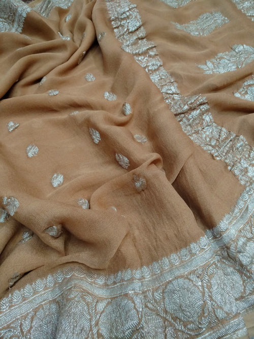 Peach Pure Georgette Banarasi Saree Jaal weaving faux watergold zari -